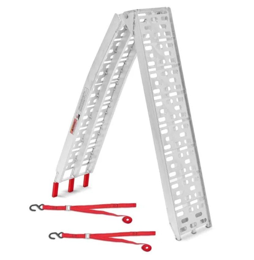 Aluminum Ramp for Easy Loading onto Trailers or Vans Extra-strong hinges allow a load capacity of up to 340 kg Suitable for all types of motorcycles (street bikes, choppers/cruisers/customs, enduro, motocross), scooters, and quads/ATVs (two ramps required) Very robust and durable while remaining lightweight Rubberized contact surfaces to prevent scratches Foldable aluminum ramp for space-saving transport and storage Dimensions: Length: 225 cm / Width: 28 cm Folded dimensions: Length 115 cm / Width 28 cm / Height 14 cm Weight: approx. 8 kg Maximum load capacity: 340 kg